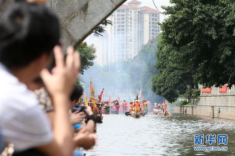 6月14日,觀(guān)眾在廣州市天河區(qū)一處河道旁等待龍舟通過(guò)。當(dāng)日,廣州市天河區(qū)舉行一場(chǎng)熱鬧歡快的龍舟活動(dòng),來(lái)自多個(gè)村莊“走親戚”的龍舟隊(duì)參加。按廣州的傳統(tǒng)習(xí)俗,每年農(nóng)歷五月初一至初五,各村的龍舟隊(duì)要到周?chē)迓洹白哂H戚”。走親戚的龍舟隊(duì)到來(lái)時(shí),受訪(fǎng)村子要準(zhǔn)備好龍舟飯招待來(lái)客?;顒?dòng)當(dāng)天,鳴炮敲鑼?zhuān)慌上矐c氣氛。新華社記者 張加揚(yáng) 攝