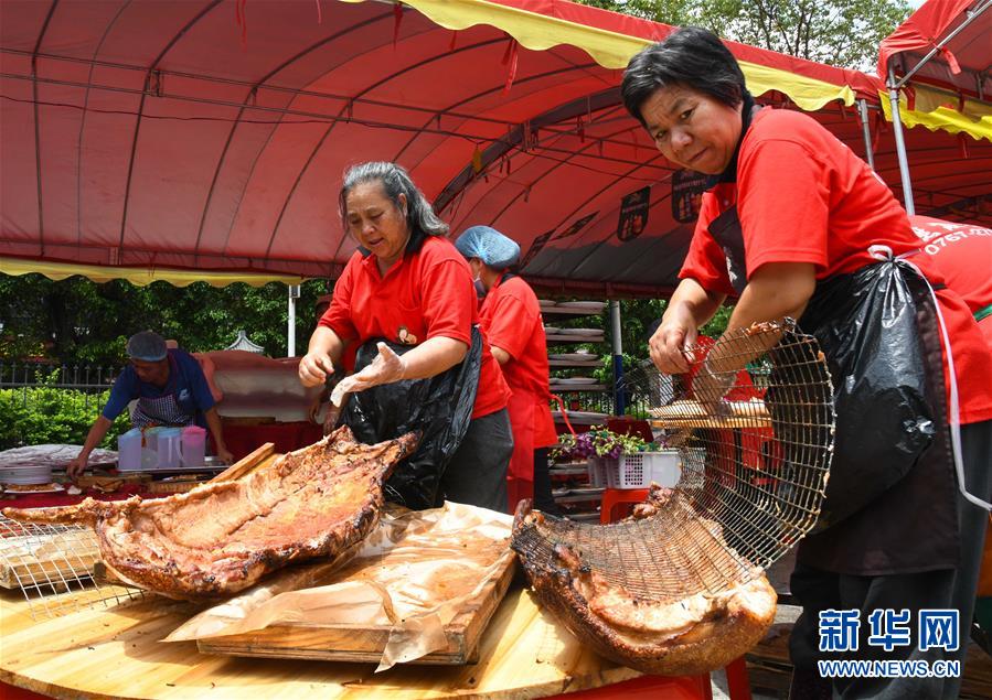 6月14日,工作人員在廣州天河區(qū)珠村七夕廣場(chǎng)準(zhǔn)備龍舟飯。當(dāng)日,廣州市天河區(qū)舉行一場(chǎng)熱鬧歡快的龍舟活動(dòng),來自多個(gè)村莊“走親戚”的龍舟隊(duì)參加。按廣州的傳統(tǒng)習(xí)俗,每年農(nóng)歷五月初一至初五,各村的龍舟隊(duì)要到周圍村落“走親戚”。走親戚的龍舟隊(duì)到來時(shí),受訪村子要準(zhǔn)備好龍舟飯招待來客?;顒?dòng)當(dāng)天,鳴炮敲鑼,一派喜慶氣氛。新華社記者 鄧華 攝