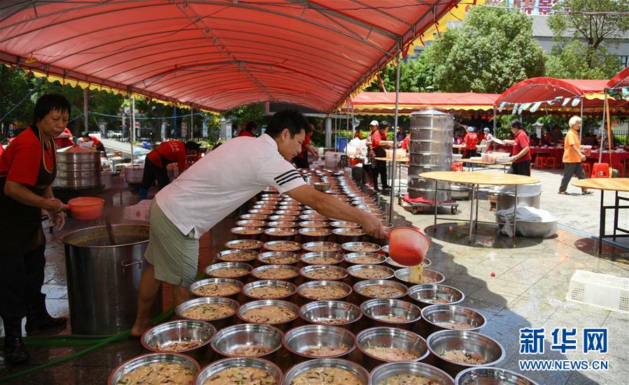 6月14日,工作人員在廣州天河區(qū)珠村七夕廣場準備龍舟飯。當日,廣州市天河區(qū)舉行一場熱鬧歡快的龍舟活動,來自多個村莊“走親戚”的龍舟隊參加。按廣州的傳統(tǒng)習(xí)俗,每年農(nóng)歷五月初一至初五,各村的龍舟隊要到周圍村落“走親戚”。走親戚的龍舟隊到來時,受訪村子要準備好龍舟飯招待來客?;顒赢斕?,鳴炮敲鑼,一派喜慶氣氛。新華社記者 鄧華 攝