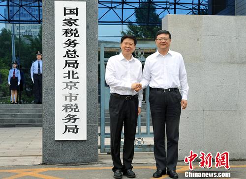國家稅務總局黨組書記、局長王軍與北京市委副書記、市長陳吉寧共同為國家稅務總局北京市稅務局揭牌。國家稅務總局供圖