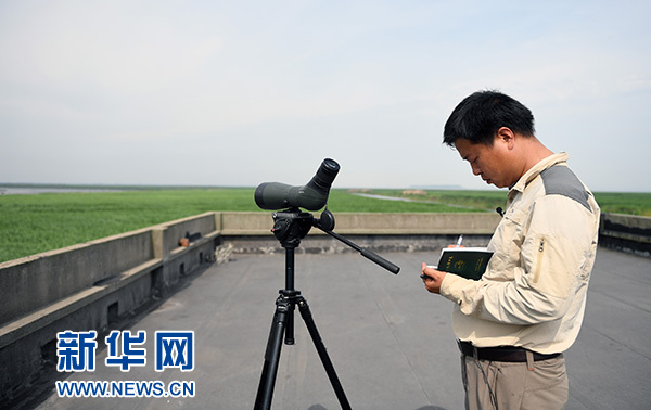 宋玉成在洞庭湖濕地記錄發(fā)現(xiàn)麋鹿的數(shù)量(2017年5月11日攝)。新華社記者 李尕 攝