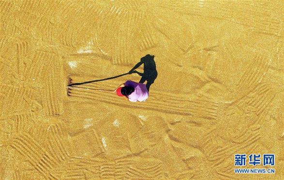 6月19日,河北省遵化市東新莊鎮(zhèn)農(nóng)民在晾曬小麥。新華社發(fā)(劉滿倉(cāng) 攝)