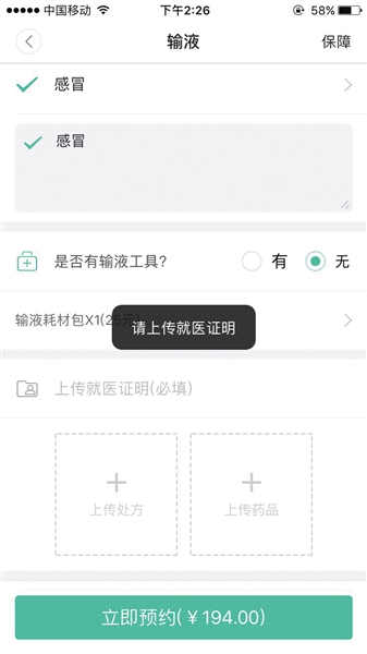 某“共享護士”平臺要求預(yù)約時提供就醫(yī)證明,但記者提供虛假資料也能通過審核。 手機截圖
