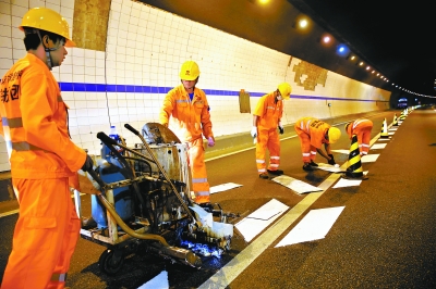 昨天上午,在懷柔區(qū)分水嶺隧道,路政養(yǎng)護人員正在安裝各類交通安全標識。隨著防撞護欄、反光輪廓、視覺減速標識陸續(xù)安裝完成,幽暗狹長的隧道變得明亮起來。據(jù)介紹,反光輪廓和視覺減速標識首次在京隧道投入使用,無論白天還是夜間,明亮的標識都能引導(dǎo)司機看清路面。