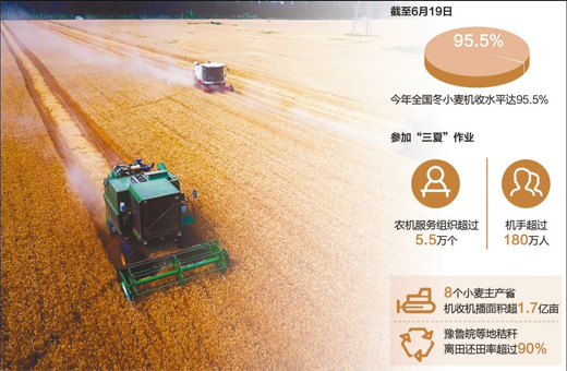 據(jù)農(nóng)業(yè)農(nóng)村部統(tǒng)計,今年全國參加“三夏”作業(yè)的農(nóng)機服務組織預計超過5.5萬個,機手超過180萬人,截至6月19日,全國冬小麥機收水平達到95.5%,8個小麥主產(chǎn)省機收、機播服務面積超過1.7億畝。全程機械化特點明顯,各地主推“一條龍”作業(yè),在搶收小麥的同時,玉米機播隨即展開,夏收、夏種、夏管這“三夏”正在變成“兩夏”。