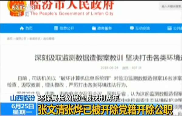 就在昨天(24日),臨汾市人民政府通過其官方網(wǎng)站發(fā)布公告稱,5月27日,已對涉案人員市環(huán)保局原局長張文清、市環(huán)保局辦公室原負責人張燁2人作出開除黨籍、開除公職的處理;對市環(huán)境監(jiān)測站原聘用人員張永鵬、李皇濤2人解除勞務(wù)合同。