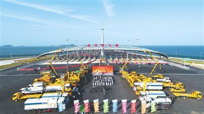 港珠澳大橋主體工程首批45輛拯救及養(yǎng)護設(shè)備近期正式交付使用,這批設(shè)備包括洗掃車、隨車吊、防撞車等。 新華社記者 梁 旭攝