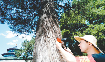6月27日,北京天壇公園管理處工人為祈年殿前的一株古樹掛上一級(jí)古樹銘牌。賀 勇攝