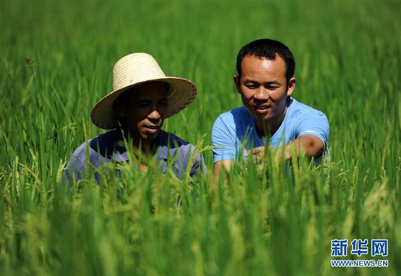 在江西永新縣三灣鄉(xiāng)三灣村田西村小組,時(shí)任村支部書記的邢鐳(右)和村民劉小林在交流紫稻生長(zhǎng)狀況(2013年8月10日攝)。新華社記者周科 攝