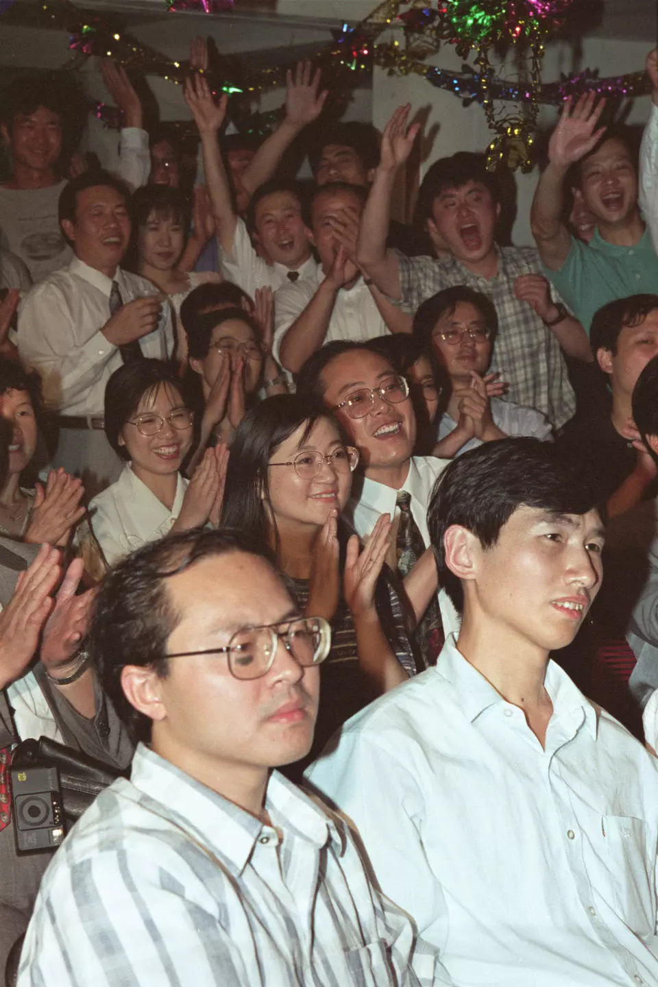 1997年6月30日,世界各地的華人華僑及中國留學(xué)生以各種方式慶祝香港回歸祖國。在日本日中友好會館后樂寮留學(xué)生宿舍舉行的聯(lián)歡晚會上,中國留學(xué)生在觀看香港政權(quán)交接儀式電視現(xiàn)場直播時,激動萬分。新華社記者 陳建力 攝