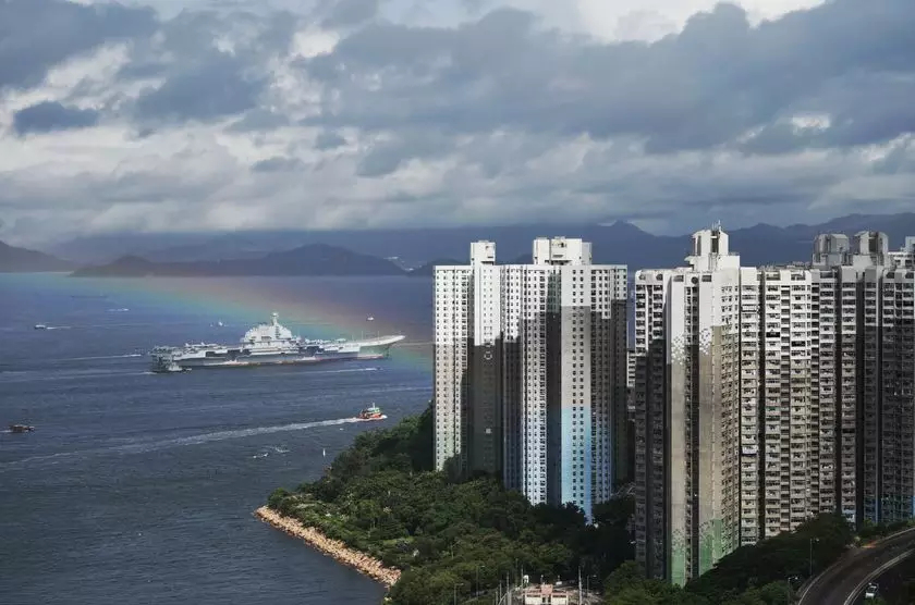 2017年7月7日,海軍遼寧艦在香港南丫島附近航行。當日,正在執(zhí)行跨區(qū)機動訓(xùn)練任務(wù)的中國人民解放軍海軍航母編隊抵達香港,參加香港回歸祖國暨中國人民解放軍進駐香港20周年慶?;顒樱艿较愀厶貐^(qū)政府和民眾熱烈歡迎。 新華社發(fā)(王申攝)