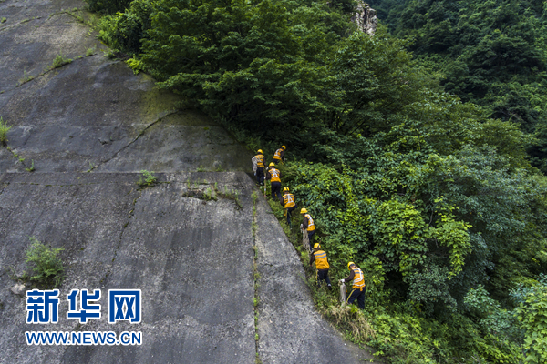 “蜘蛛俠”們穿過(guò)雜樹(shù)叢爬上陡坡準(zhǔn)備作業(yè)。新華網(wǎng) 王頔攝