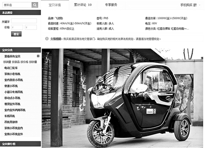 北青報記者登錄淘寶平臺,選擇了一家發(fā)貨地址為北京,售價在萬元左右,標(biāo)稱為電動三輪車,成人家用豪華全封閉代步車的商品。雖然店家表示北京的銷售正常進行,但北青報記者發(fā)現(xiàn),在商品頁面靠前的位置,平臺打出了一行前面帶有感嘆號的交易提醒:“購買前請咨詢當(dāng)?shù)亟还懿块T,確定購買地的相關(guān)法律法規(guī)規(guī)定,請遵循當(dāng)?shù)毓芾硪?guī)定?!北鼻鄨笥浾哂炙阉髁似渌恍╇妱尤嗆嚒⑺妮嗆嚿唐?,部分商品在彈出時,頁面上會顯示“交易提醒”的提示,但并不是所有類似產(chǎn)品都進行了提醒。