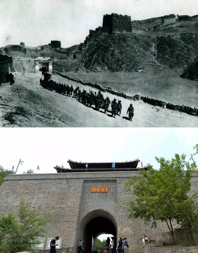 上圖為日軍進入古北口鎮(zhèn)城門(資料照片);下圖為2017年6月21日拍攝的古北口鎮(zhèn)城門(新華社記者 王化娟 攝)。