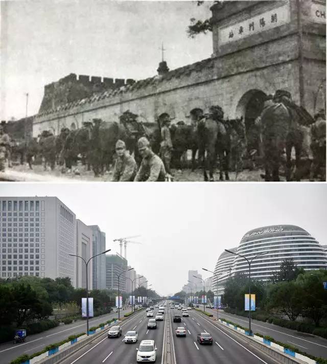 上圖為1937年8月8日,日本騎兵在朝陽門車站集結(jié)(資料照片);下圖為2017年7月3日拍攝的朝陽門地區(qū)(新華社記者 張晨霖 攝)。