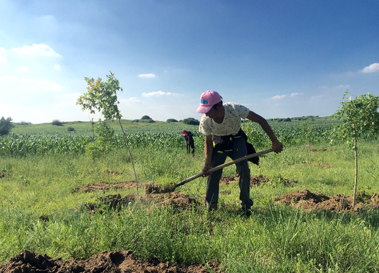 一路上,看到有幾十個(gè)村民在林地里忙碌著植樹(shù)。先是用鐵鍬在土地里刨坑,然后把帶有土壤的樟子松或五角楓樹(shù)放在刨好的坑里栽上。在長(zhǎng)時(shí)間強(qiáng)烈的日照下,盡管他們戴著太陽(yáng)帽,或穿戴嚴(yán)實(shí)、裹著頭巾,皮膚照樣曬得黝黑。村民告訴記者,因?yàn)椴挥萌ネ獾卮蚬?,可以在自己家的地盤(pán)上種樹(shù),有收入,雖然苦點(diǎn),還是很幸福的。