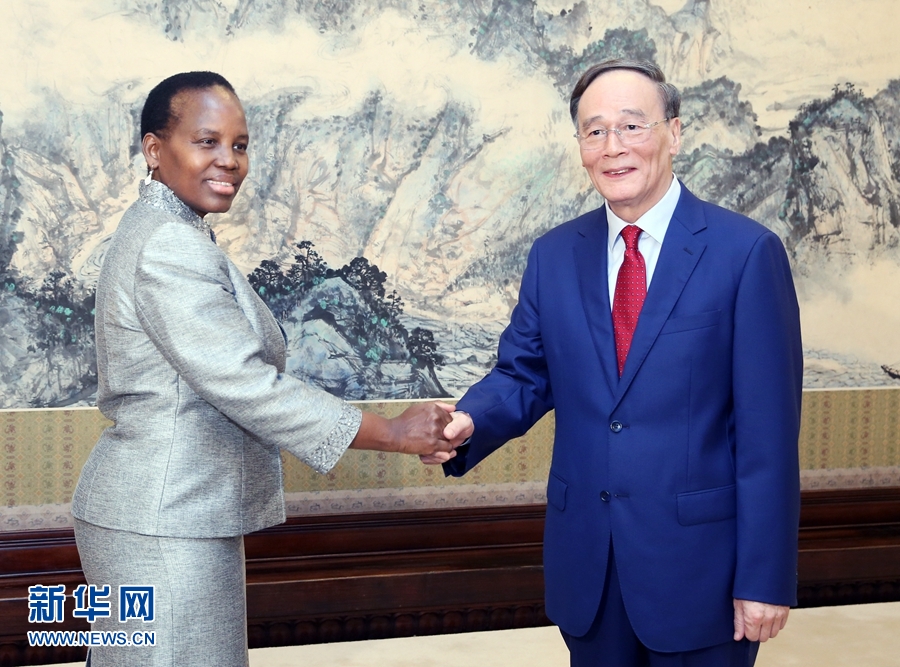 ?7月13日,國家副主席王岐山在北京中南海會見博茨瓦納國際事務(wù)與合作部長尤妮蒂·道。 新華社記者 姚大偉 攝