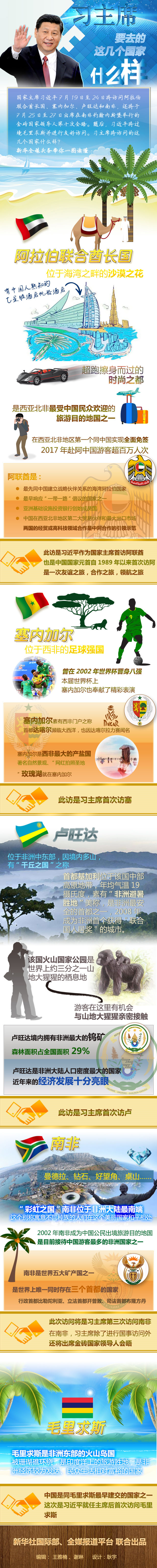 季夏之月,赴萬里之約。7月19日至28日,習(xí)近平主席將對阿聯(lián)酋、塞內(nèi)加爾、盧旺達(dá)和南非進(jìn)行國事訪問,出席在南非約翰內(nèi)斯堡舉行的金磚國家領(lǐng)導(dǎo)人第十次會晤,過境毛里求斯并進(jìn)行友好訪問。