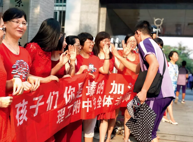 ▲ 6月24日,北京理工大學(xué)附屬中學(xué)分??键c外,初三老師與考生擊掌,為其加油鼓勁 蔡文玲攝