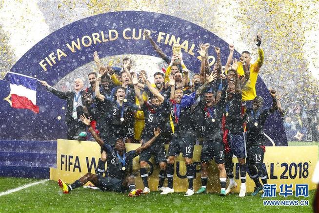 圖為2018年7月15日,在莫斯科進(jìn)行的2018俄羅斯世界杯足球賽決賽中,法國隊(duì)球員在頒獎(jiǎng)儀式上慶祝。法國隊(duì)以4比2戰(zhàn)勝克羅地亞隊(duì),繼1998年后再奪世界杯冠軍。新華社記者曹燦 攝