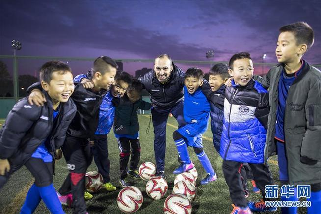 圖為2017年12月8日,在武漢市足球青訓(xùn)營,西班牙巴塞羅那足球?qū)W校職業(yè)教練塞爾希奧(中)在訓(xùn)練后與小學(xué)員合影。新華社記者肖藝九 攝