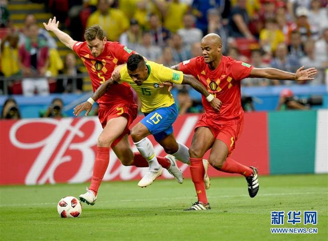 圖為2018年7月6日,在喀山進(jìn)行的2018俄羅斯世界杯足球賽四分之一決賽中,巴西隊(duì)球員保利尼奧(中)與比利時(shí)隊(duì)球員維爾通亨(左)、孔帕尼在比賽中拼搶。巴西隊(duì)以1比2不敵比利時(shí)隊(duì),無緣四強(qiáng)。新華社記者杜宇 攝