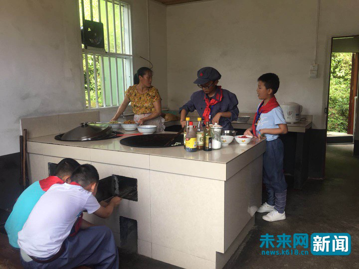 前來(lái)井岡山茅坪鄉(xiāng)壩上村體驗(yàn)“紅軍的一天”教育的小學(xué)生自己動(dòng)手做飯。未來(lái)網(wǎng)記者 楊佩穎 攝