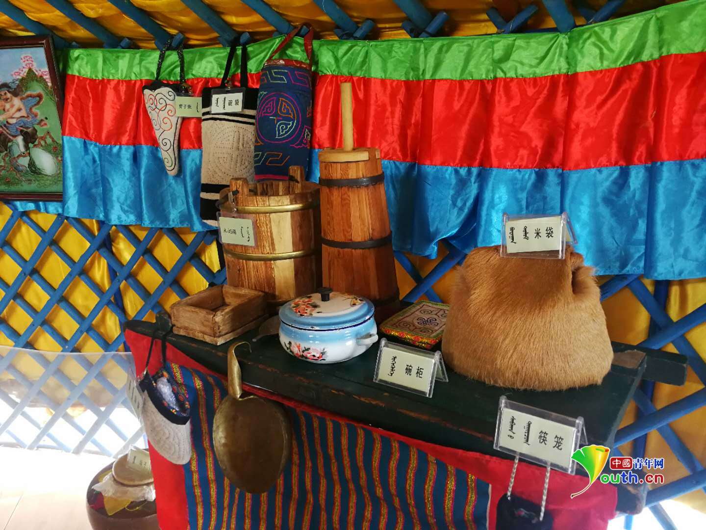 為了讓自家的旅游服務(wù)做的更好,蘇·呼格吉勒?qǐng)D專門設(shè)計(jì)了一個(gè)獨(dú)特的蒙古包“展廳”,里面全是牧民生產(chǎn)工具和生活用品:接羊羔的氈口袋、做酸奶的竹筒、弓箭、燭臺(tái)、皮口袋、搖籃等等。作為一個(gè)熱愛傳統(tǒng)民俗的牧人,蘇.呼格吉勒?qǐng)D把這些帶有蒙古族文化元素的“寶貝”一一收集起來,讓每一位來到這里的游客都能親身體驗(yàn)到傳統(tǒng)游牧文化的魅力。