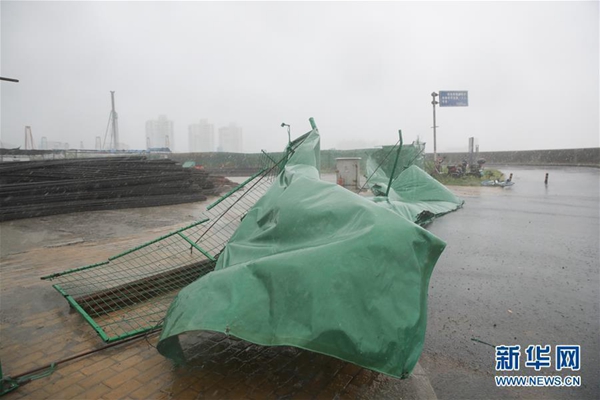 7月22日,在上海吳淞口國際郵輪碼頭,岸邊的防護(hù)欄被大風(fēng)吹垮。據(jù)上海中心氣象臺消息,今年第10號臺風(fēng)“安比”(強(qiáng)熱帶風(fēng)暴級)的中心已于7月22日12時(shí)30分在上海崇明東部登陸,登陸時(shí)中心附近最大風(fēng)力有10級(28米/秒),中心最低氣壓982百帕,登陸后繼續(xù)向西北方向移動,強(qiáng)度逐漸減弱。新華社記者丁汀攝