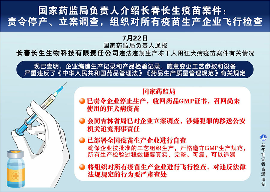新華社北京7月22日電(記者齊中熙、趙文君)國(guó)家藥監(jiān)局負(fù)責(zé)人22日通報(bào)長(zhǎng)春長(zhǎng)生生物科技有限責(zé)任公司違法違規(guī)生產(chǎn)凍干人用狂犬病疫苗案件有關(guān)情況。這位負(fù)責(zé)人說,國(guó)家藥監(jiān)局已責(zé)令企業(yè)停止生產(chǎn),收回藥品GMP證書,同時(shí)會(huì)同吉林省局已對(duì)企業(yè)立案調(diào)查,涉嫌犯罪的移送公安機(jī)關(guān)追究刑事責(zé)任。國(guó)家藥監(jiān)局將組織對(duì)所有疫苗生產(chǎn)企業(yè)進(jìn)行飛行檢查,對(duì)違反法律法規(guī)規(guī)定的行為要嚴(yán)肅查處。