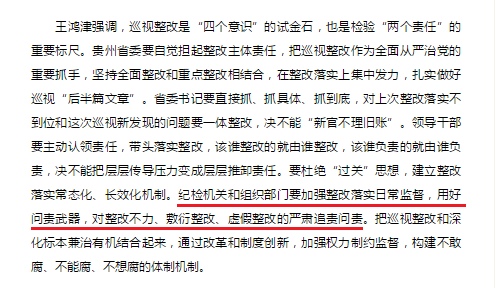 巡視發(fā)現(xiàn)問題的目的是解決問題,發(fā)現(xiàn)問題不解決,比不巡視的效果還壞!本輪巡視,中央巡視組把十八屆巡視整改情況作為巡視監(jiān)督重點,對照巡視報告、反饋意見以及被巡視黨組織整改報告,有重點地監(jiān)督檢查,看巡視發(fā)現(xiàn)的問題是否整改到位,有沒有報假賬、做表面文章;巡視移交的問題線索是否認真處置、核查,巡視反映強烈的領(lǐng)導(dǎo)干部是否依然有反映或者有新的反映。剛剛公布的巡視反饋情況顯示,一些地方“對十八屆中央巡視發(fā)現(xiàn)的‘三超兩亂’等問題整改落實不夠到位”“上次中央巡視整改不嚴不實,存在掛空檔、走過場現(xiàn)象”“巡視整改存在做表面文章現(xiàn)象”。中央巡視組組長在代表中央巡視組反饋巡視情況時也給出明確意見,要求“統(tǒng)籌抓好上次巡視整改不到位和本次巡視指出問題的整改”。