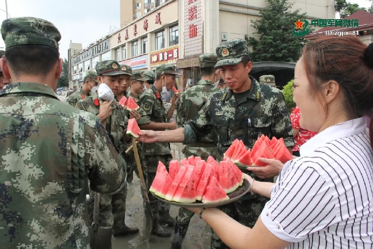 群眾自發(fā)為救災(zāi)官兵送西瓜。劉學功 攝