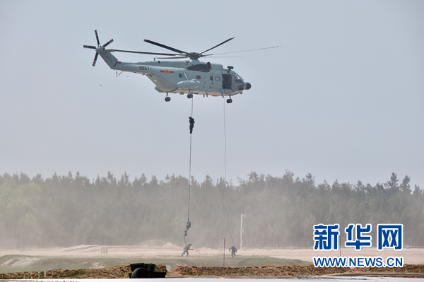7月29日,在福建泉州賽區(qū)開幕式上,中國海軍陸戰(zhàn)隊在三棲立體登陸作戰(zhàn)課目軍事表演中搭乘艦載直升機(jī)滑降。當(dāng)日,“國際軍事比賽-2018”中國承辦賽事開幕式分別在新疆庫爾勒市和福建泉州市舉行。 新華社記者 姜克紅 攝