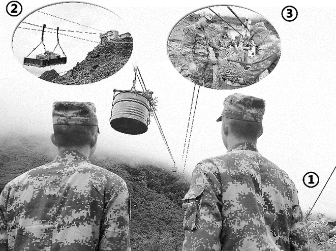在索道運(yùn)輸平臺(tái)上,連隊(duì)官兵將副食、報(bào)紙書(shū)籍等物資,裝入幾個(gè)特制鐵箱中。在他們身旁,一根杯口粗的鋼索直入云霄……