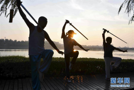 8月3日,亳州市市民在渦河公園晨練健身。盛夏時節(jié),安徽省亳州市不少市民走出家門,通過習(xí)練太極拳、太極劍等運動方式,享受晨練健身帶來的樂趣。 新華社發(fā)(劉勤利 攝)