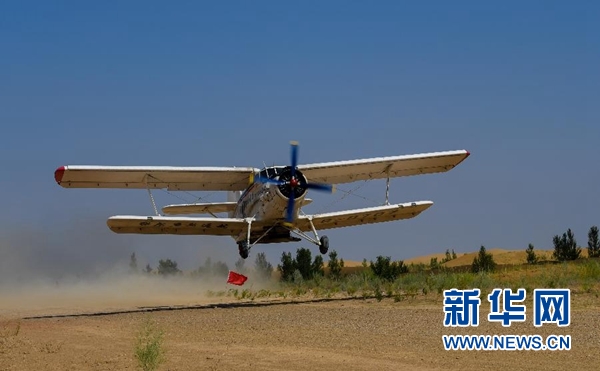 在內(nèi)蒙古鄂爾多斯市的庫(kù)布其沙漠腹地,一架飛播造林用的飛機(jī)起飛(7月11日攝)。 新華社記者 彭源 攝
