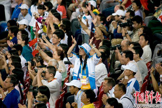 2008年8月21日,國家體育場“鳥巢”,志愿者帶領(lǐng)觀眾為運動員鼓掌。中國青年報·中青在線記者 陳劍/攝
