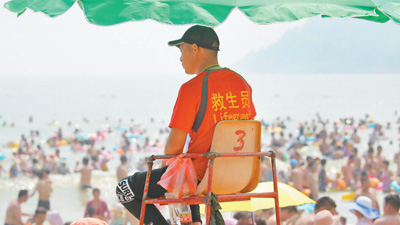 8月5日,一名救生員在江蘇省連云港市連島海水浴場移動瞭望塔上值守。王健民攝(人民視覺)