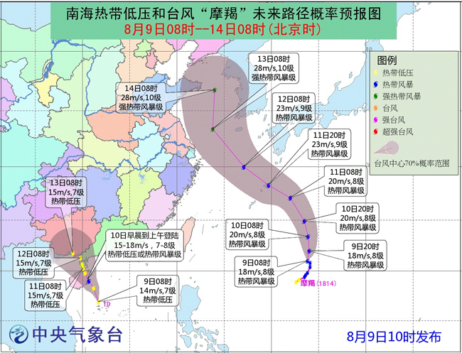 今年第14號臺風(fēng)“摩羯”昨天在臺灣以東洋面生成。預(yù)計“摩羯”將于11日夜間進(jìn)入東海東部海面,之后在我國東部海區(qū)北上,強(qiáng)度逐漸加強(qiáng)到強(qiáng)熱帶風(fēng)暴級(10~11級,25~30米/秒)。12日至14日,東海北部、黃海將先后出現(xiàn)7~9級大風(fēng),臺風(fēng)中心經(jīng)過的海域風(fēng)力有10~11級、陣風(fēng)12~13級。
