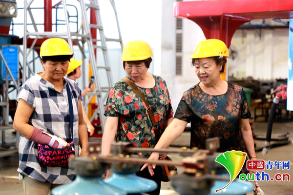 2018年,侯愛華、胡學政、白燕娥(從左至右)參觀現(xiàn)代化鐵路車間。中國青年網見習記者 李慧慧 攝