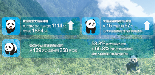 野外調(diào)查顯示,我國野生大熊貓種群從上世紀(jì)七八十年代的1114只增長到1864只,大熊貓自然保護(hù)區(qū)從15個增長到67個,形成大熊貓棲息地保護(hù)網(wǎng)絡(luò)體系。受保護(hù)的大熊貓棲息地面積從139萬公頃增長到258萬公頃,53.8%的大熊貓棲息地和66.8%的野生大熊貓種群被納入自然保護(hù)區(qū)有效保護(hù)中。