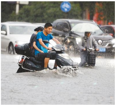 8月4日,江西省九江市出現(xiàn)強(qiáng)降雨,市民騎車涉水前行。人民視覺