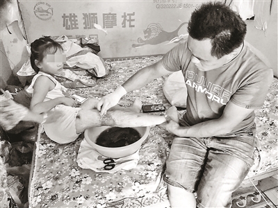 欣欣側(cè)身坐臥在床上,戴著塑膠手套的張志成正在為女兒換藥。右腿膝蓋后窩處的傷口面積很大,夏天化膿尤為嚴(yán)重,平常清洗創(chuàng)面、換藥這些事對(duì)張志成來說已經(jīng)輕車熟路了。懂事的欣欣沒有哭鬧,也沒有喊疼。