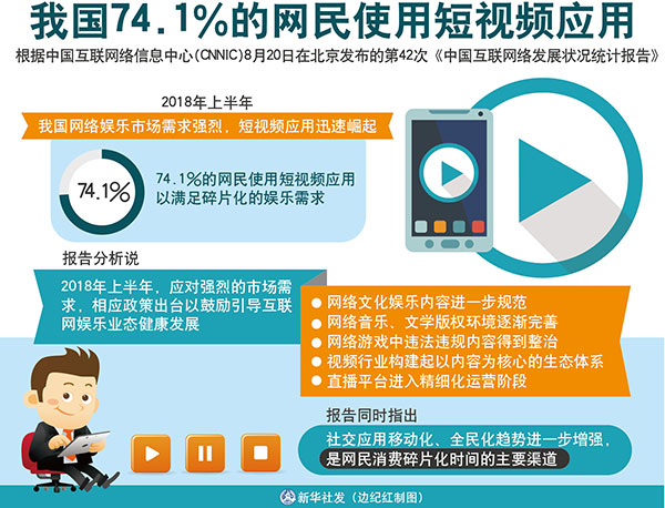 新華社北京8月20日電(記者施雨岑、王思北)根據(jù)中國互聯(lián)網(wǎng)絡信息中心(CNNIC)20日在京發(fā)布的第42次《中國互聯(lián)網(wǎng)絡發(fā)展狀況統(tǒng)計報告》,2018年上半年,我國網(wǎng)絡娛樂市場需求強烈,短視頻應用迅速崛起,74.1%的網(wǎng)民使用短視頻應用,以滿足碎片化的娛樂需求。