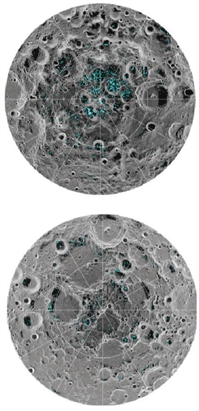 圖中淺藍色區(qū)域就是發(fā)現(xiàn)水冰的地方,上圖為月球南極,下圖為月球北極。圖/NASA