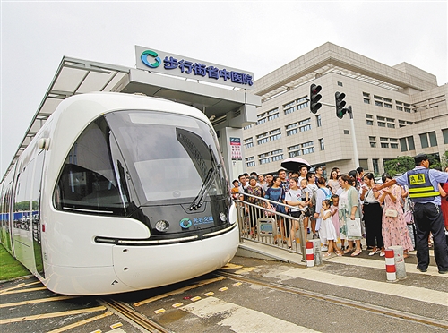 湖北省武漢市省中醫(yī)院門口,乘客在等待有軌電車。近年來,當(dāng)?shù)匕训罔F、有軌電車、公交車和出租車站點(diǎn)安排在離醫(yī)院近的地方,讓百姓方便就醫(yī)。鄭傳海 攝