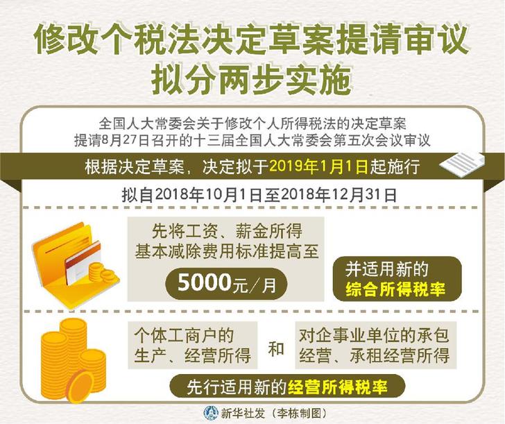 新華社北京8月27日電(記者韓潔、郁瓊源)全國(guó)人大常委會(huì)關(guān)于修改個(gè)人所得稅法的決定草案提請(qǐng)27日召開(kāi)的十三屆全國(guó)人大常委會(huì)第五次會(huì)議審議。該決定擬自2019年1月1日起施行,但部分減稅政策擬于2018年10月1日起先行實(shí)施。