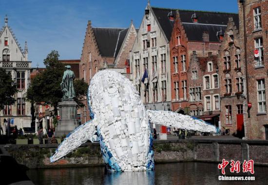資料圖:當(dāng)?shù)貢r(shí)間7月2日,來自紐約布魯克林的建筑設(shè)計(jì)公司StudioKCA用從海洋中打撈起來的5噸塑料垃圾,打造了一個38英尺(約11.6米)高的巨型鯨魚“摩天大樓”(Skyscraper)。提醒人們關(guān)注塑料污染。