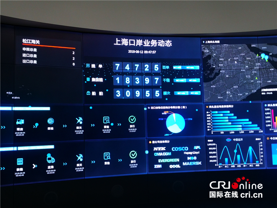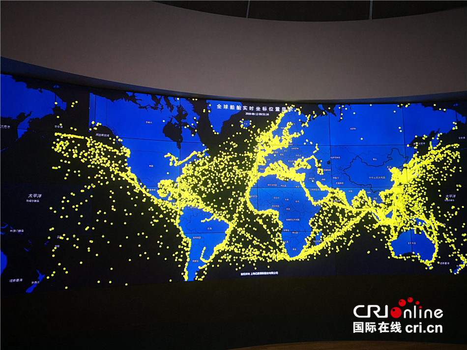 在上海國際貿(mào)易單一窗口運營方、上海億通公司的電子大屏上,密密麻麻的黃色光點顯示著全球船舶的實時坐標位置、上??诎稑I(yè)務動態(tài)等關鍵信息。
