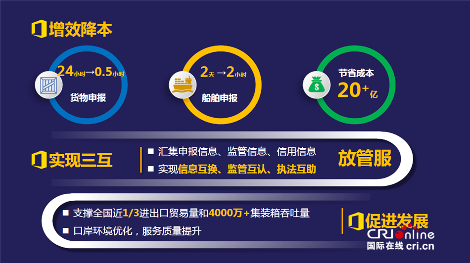 國際貿(mào)易單一窗口的運營,為貿(mào)易船舶進出上海港大大節(jié)約了時間和成本。辦通關手續(xù)實現(xiàn)了從“人跑路”向“信息跑路”的轉(zhuǎn)變,提交的資料由四套系統(tǒng)1113項數(shù)據(jù)簡化為一套系統(tǒng)388個數(shù)據(jù),船舶進出港環(huán)節(jié)全流程從原來的2天縮短至2小時,貨物進出口申報環(huán)節(jié)全流程從24小時縮短至半個小時。